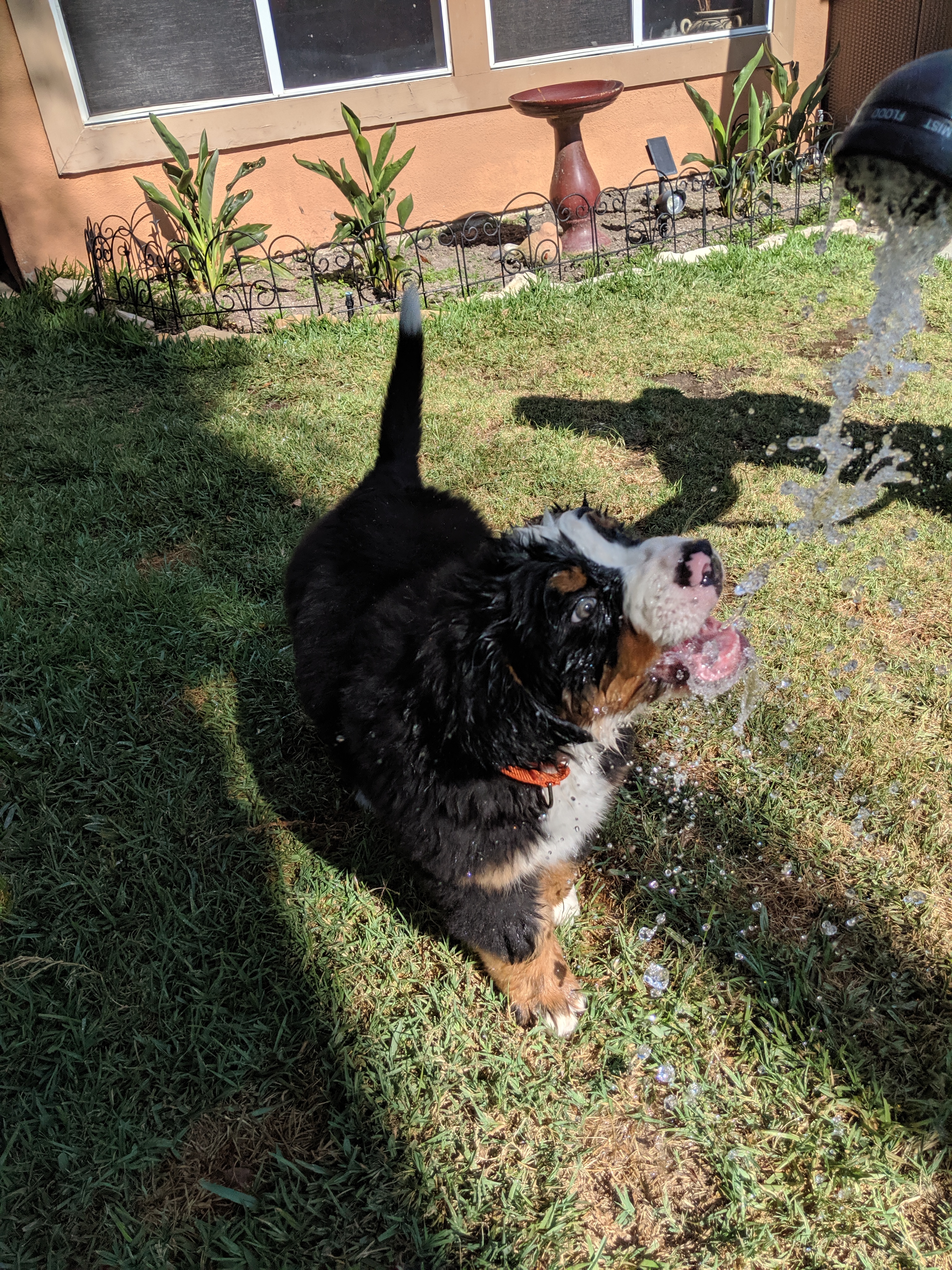 A walk every morning and running in the yard with my sister keeps me fit and trim. Sometimes I even play “catch with water”. In the summer time I swim in the pool but winter is my favorite. The cool nights make my heart happy.